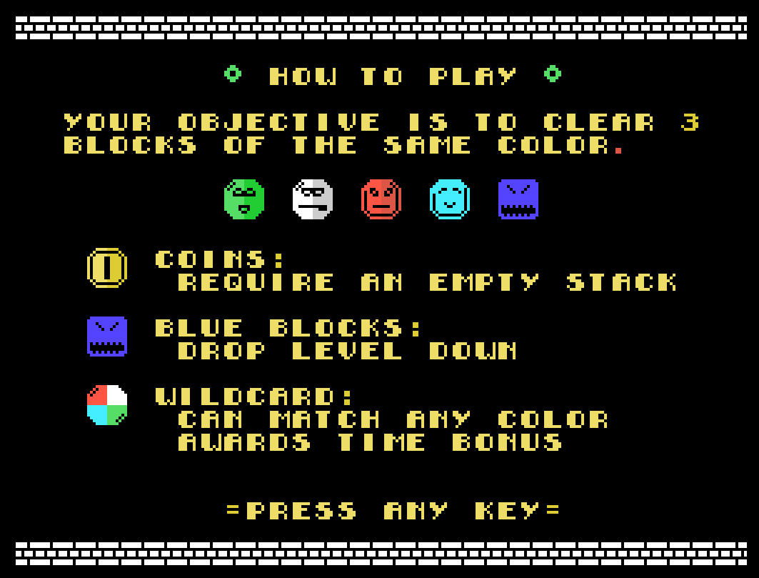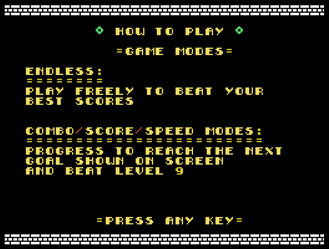 Your objective is to clear as many blocks as possible before the screen moves down and crushes you. Several game modes are available for a different challenge every time!
